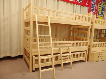 2段ベットに収納ベットを加えました。 子供さんが3人いるご家庭や補助ベットとして利用できます。 3段重ねにすると天井の高さの関係上、1段の高さが狭くなるためです。 収納ベットにはキャスターがついていますので、お休みになる時には、引き出して使えます。 また、普段使わない布団や衣類等の収納にも使えます。