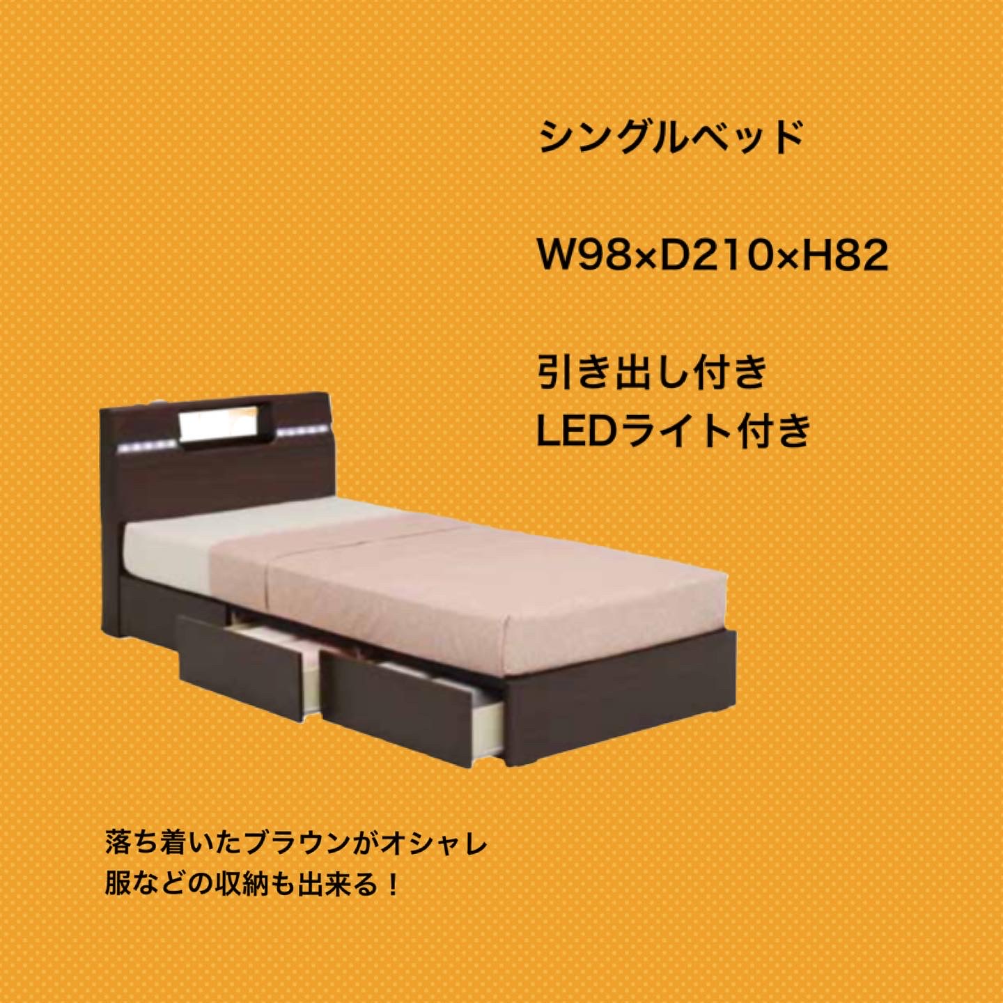 こちらのシングルベッドは引出しとLEDランプがついてます。