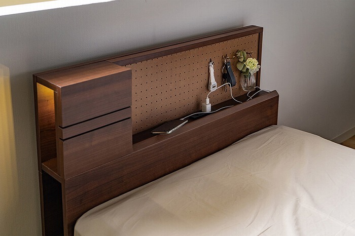また、ヘッドボードは有孔ボードになっていて、フックを付けると鍵を掛けられたりと便利です。